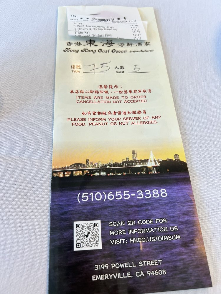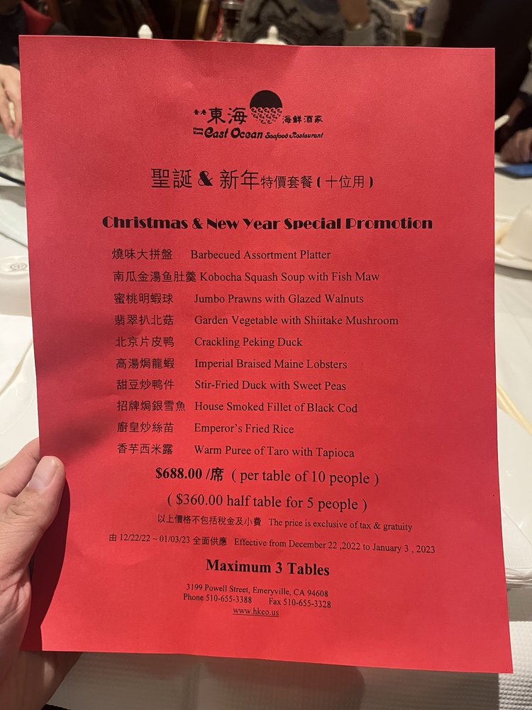 Welcome to the exquisite Hong Kong East Ocean Seafood Restaurant, located in Emeryville, CA. This restaurant offers a wide range of sumptuous seafood dishes, including fresh lobster sashimi, braised lobster, geoduck sashimi, and more. Their appetizers, such as the Barbecued Assortments Platter and the Chilled Seafood Assortments Platter, are a perfect start to your meal. Don't miss out on their Eight Jewels Winter Melon Soup and Empress Seafood Soup, which are bursting with flavors. The restaurant's stunning location by the water provides a beautiful ambiance for a memorable dining experience. With a diverse menu, including vegan and vegetarian options, Hong Kong East Ocean Seafood Restaurant caters to all tastes. The impeccable service and breathtaking views make this restaurant a must-visit for any seafood lover.